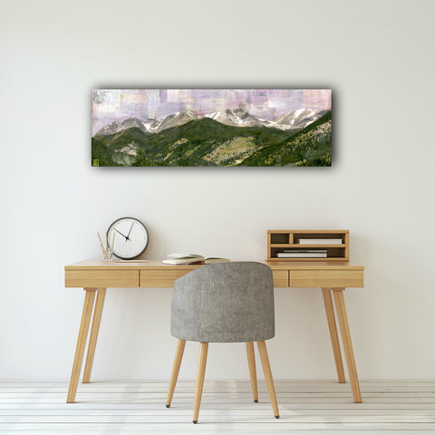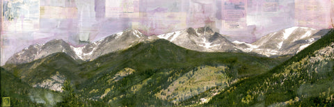Prior to sunrise at Rocky Mountain National Park when the skies transition to lavender.  This panoramic mixed media painting contains layers of acrylic paints, local vintage ephemera (including old park brochures, pamphlets and guide book pages) anchored by my photography from the park to create a vintage inspired original.